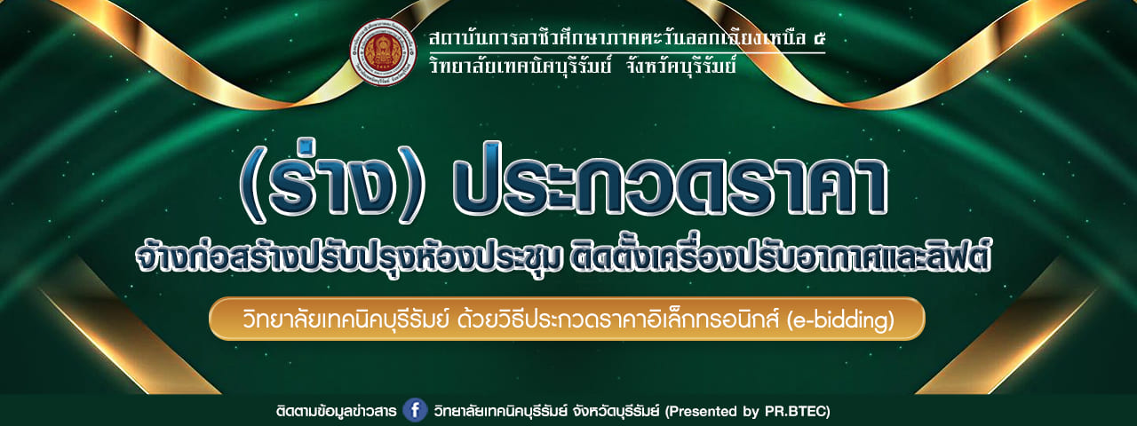 ประกวดราคา จ้างก่อสร้างปรับปรุงห้องประชุม ติดตั้งเครื่องปรับอากาศและลิฟต์ วิทยาลัยเทคนิคบุรีรัมย์ ด้วยวิธีประกวดราคาอิเล็กทรอนิกส์ (e-bidding)...