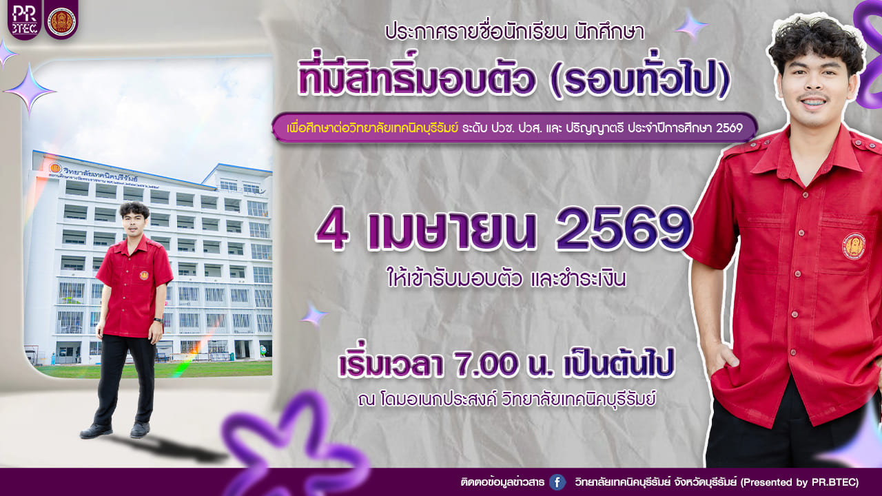 ประกาศรายชื่อนักเรียน นักศึกษา ที่มีสิทธิ์มอบตัว (รอบทั่วไป) ระดับ ปวช. ปวส. และ ปริญญาตรี ประจำปีการศึกษา 2569...