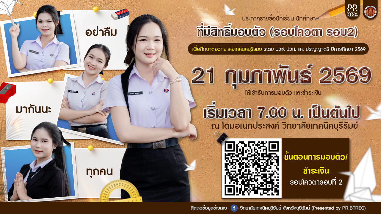 ประกาศรายชื่อนักเรียน นักศึกษา ที่มีสิทธิ์มอบตัว (รอบโควตา รอบ2) ระดับ ปวช. ปวส. และ ปริญญาตรี ประจำปีการศึกษา 2569...
