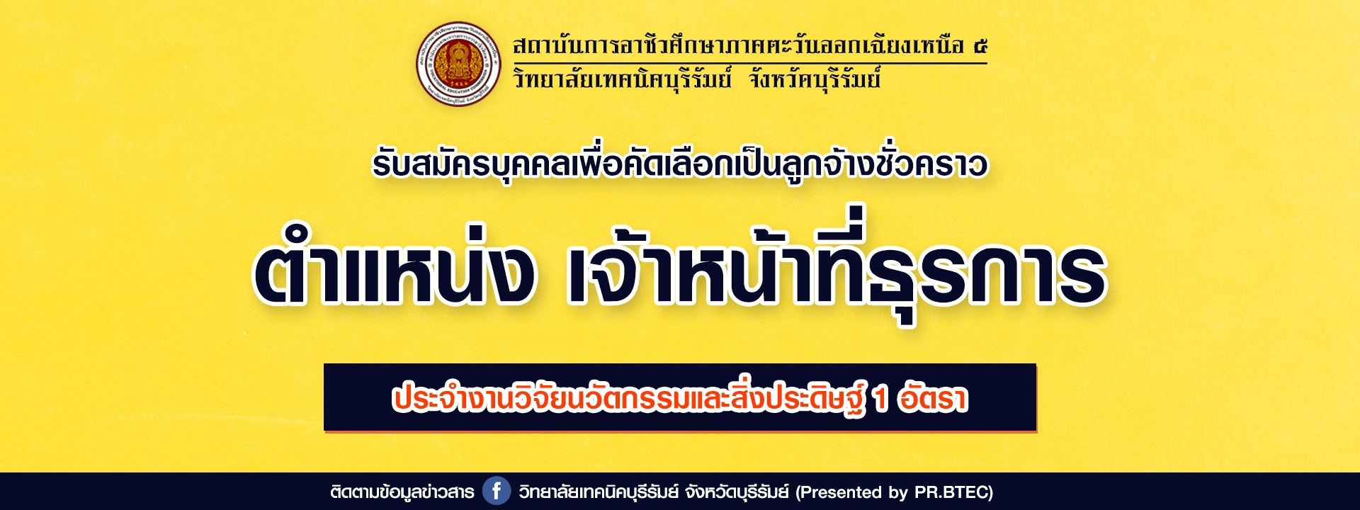 รับสมัครบุคคลเพื่อคัดเลือกเป็นลูกจ้างชั่วคราว ตำแหน่ง เจ้าหน้าที่ธุรการ ประจำงานวิจัยนวัตกรรมและสิ่งประดิษฐ์ 1 อัตรา...