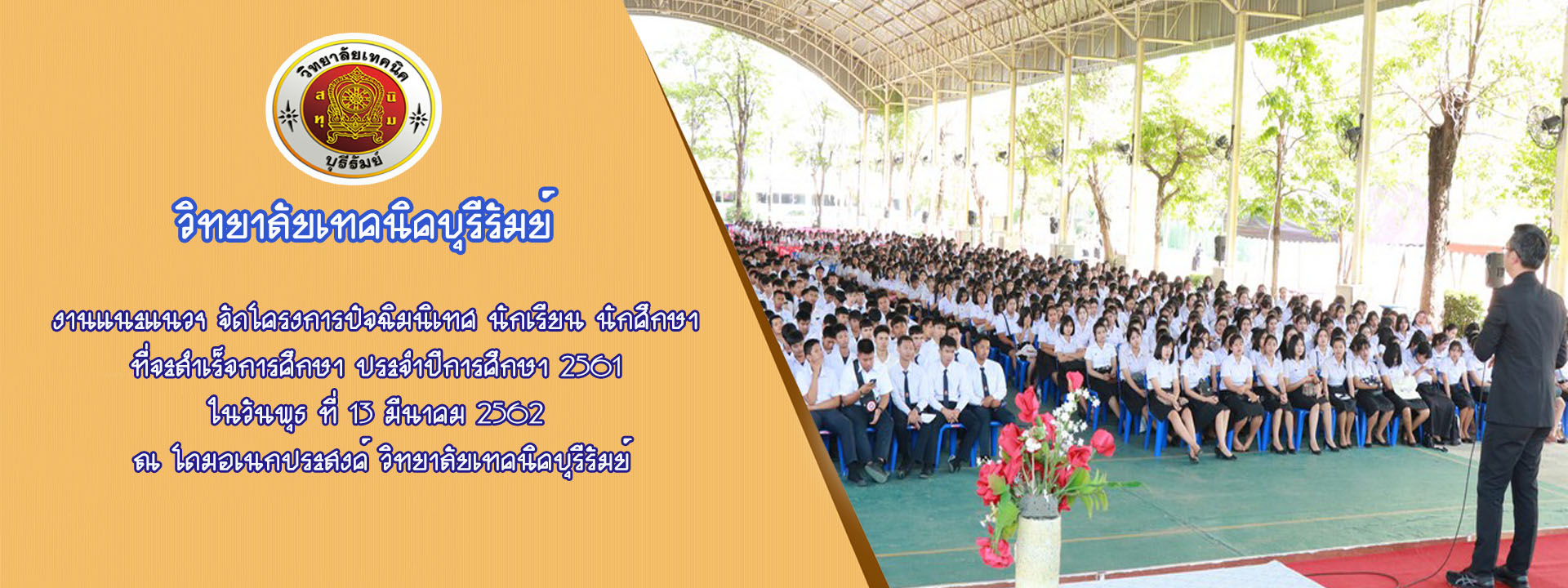 งานแนะแนว วิทยาลัยเทคนิคบุรีรัมย์ จัดการปัจฉิมนิเทศ นักเรียน นักศึกษา ที่จะสำเร็จการศึกษา ประจำปีการศึกษา 2561 ในวันพุธ ที่ 13 มีนาคม 2562 ณ โดมอเนกประสงค์ โดยมีนายสง่า แต่เชื้อสาย ผู้อำนวยการให้เกียรติมาเป็นประธานเปิดงาน และได้รับเกียรติจากหอการ...